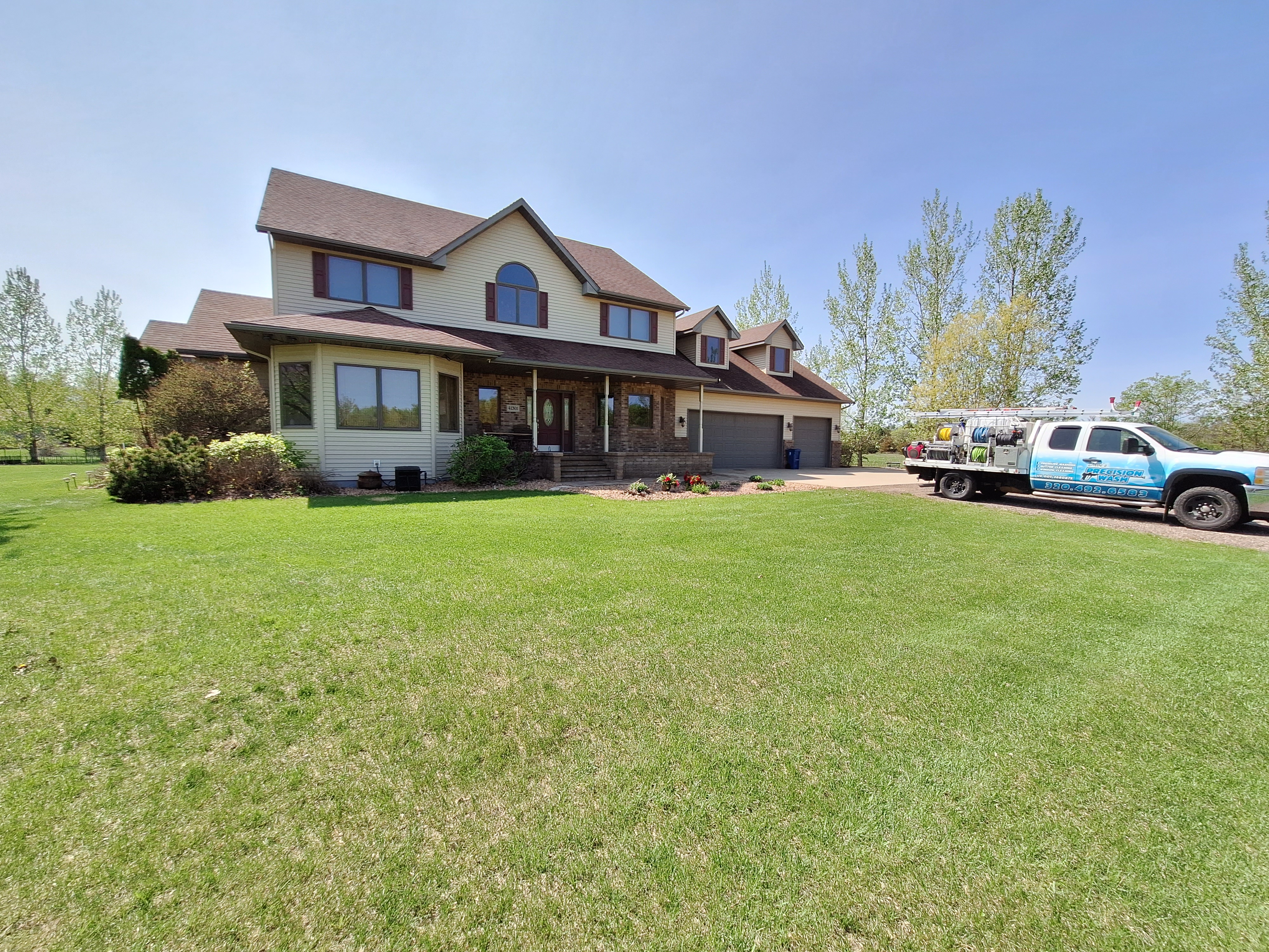 Another day, another house washing project! This country home had years or organic growth built up on its surfaces. Our house washing process safety removes this growth without damaging any surfaces or vegetation. We also pressure washed the patio, walkway, retaining walls and driveway. And for the final touch, we washed the windows. This home is ready for summer. Give us a call today to discuss your pressure washing project!